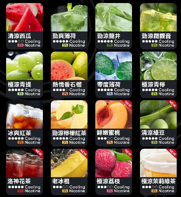 | 口味 | 清涼西瓜, 勁爽薄荷(5%), 勁涼龍井, 勁涼鐵觀音, 極涼青堤, 熱情番石榴, 零度薄荷(5%), 極涼青檸, 冰爽紅茶, 勁涼檸檬紅茶, NEW鮮嫩蜜桃, NEW清涼綠豆, NEW洛神花茶, NEW老冰棍, NEW極涼荔枝, NEW極涼茉莉綠茶 |
